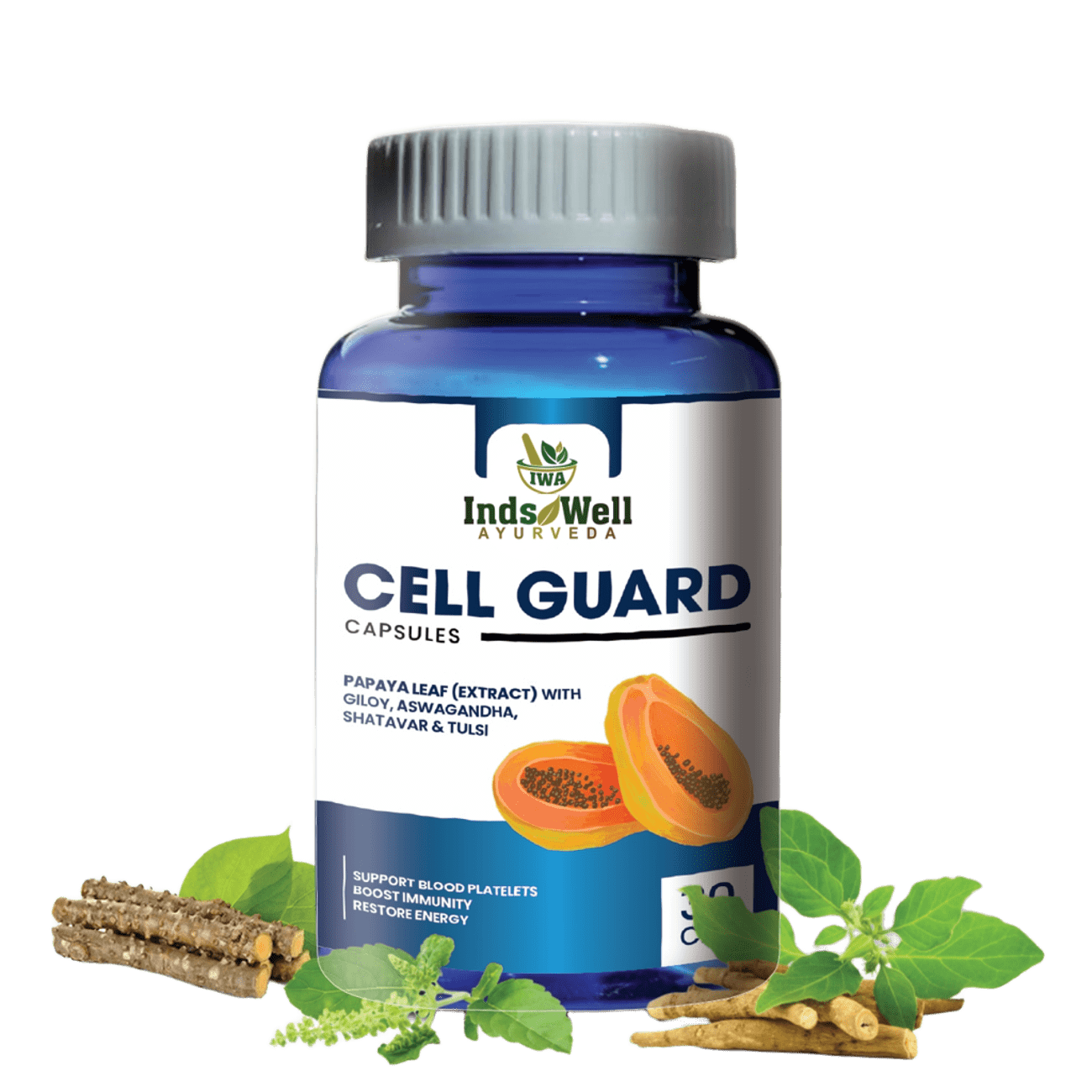 Cell Guard Capsule is a powerful Ayurvedic formulation created to support healthy platelet levels, immunity, and recovery. It contains Carica Papaya leaf extract, Giloy, Amla, Kalmegh, Bhui Amla, Ashwagandha, Yashtimadhu, and Rohitak—herbs traditionally known for promoting blood strength and recovery after illness. These ingredients help support platelet production, enhance immunity, reduce weakness, and improve overall vitality. Ideal for individuals recovering after viral infections, low energy, or seasonal weakness. Safe for long-term use under guidance, Cell Guard Capsule helps restore strength, promotes wellness, and supports balanced hematological health.