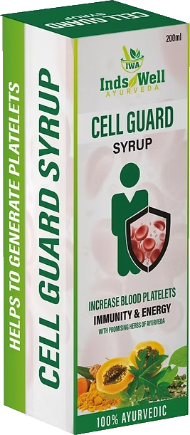 Cell Guard Syrup is a restorative Ayurvedic platelet-support formula containing Papaya Leaf, Giloy, Kalmegh, Amla, and Ashwagandha. It is designed to naturally support platelet count, boost immunity, and enhance recovery during seasonal weakness, viral phases, or fatigue. These herbs help purify the blood, strengthen energy, and assist the body in faster healing. Cell Guard also supports liver health and overall vitality. Safe for regular use during recovery and ideal for adults needing immunity and platelet support.